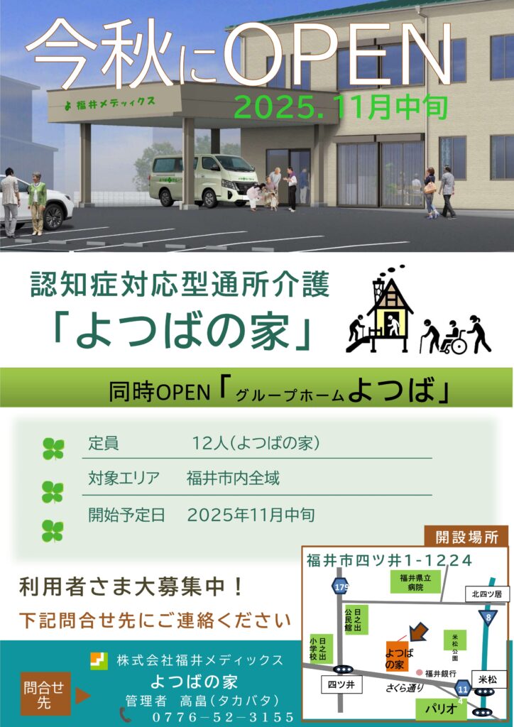 「よつばの家」新規オープン予定! 2025.10.02 「よつばの家」新規オープン予定! 2025年11月中旬! 福井市四ツ井に認知症対応型通所介護「よつばの家」が新規オープン! 利用者を募集しております。 お気軽にお問い合わせください! 電話番号:0776-52-3155担当:高畠(タカバタ)